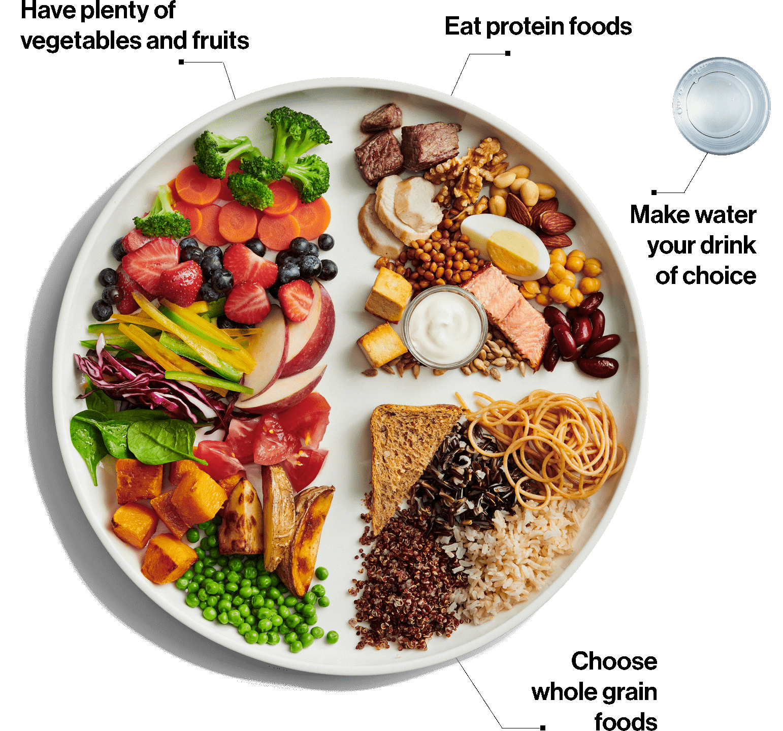 Canada Food Guide recommends that adults eat roughly 2,000 calories a day however individual needs may vary. When you eat a meal, your plate should include protein, fruits and vegetables, healthy fats and whole grains. Each of these serves a purpose in keeping your body healthy.
