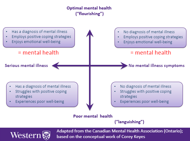 Mental health is the state of one’s mental and emotional well-being and involves living a “satisfying, hopeful, and contributing life” (Mental Health Training PPT) that allows one to build the skills they need to be successful; whereas, mental illness is a diagnosable issue that severely interferes with one’s “cognitive, emotional, and behavioural/social abilities” (QUOTE) and daily functioning. The state of one’s mental health can be thought of as existing on a continuum, based on one’s level of emotional well-being and use of positive coping strategies. In this way, you could have no diagnosis of a mental illness and still have poor mental health, or you could have a diagnosis but still enjoy positive mental health.