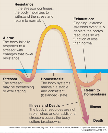 The following diagram is helpful for understanding the process the body goes through from the initial stages of stress to the hopeful return to homeostasis.
